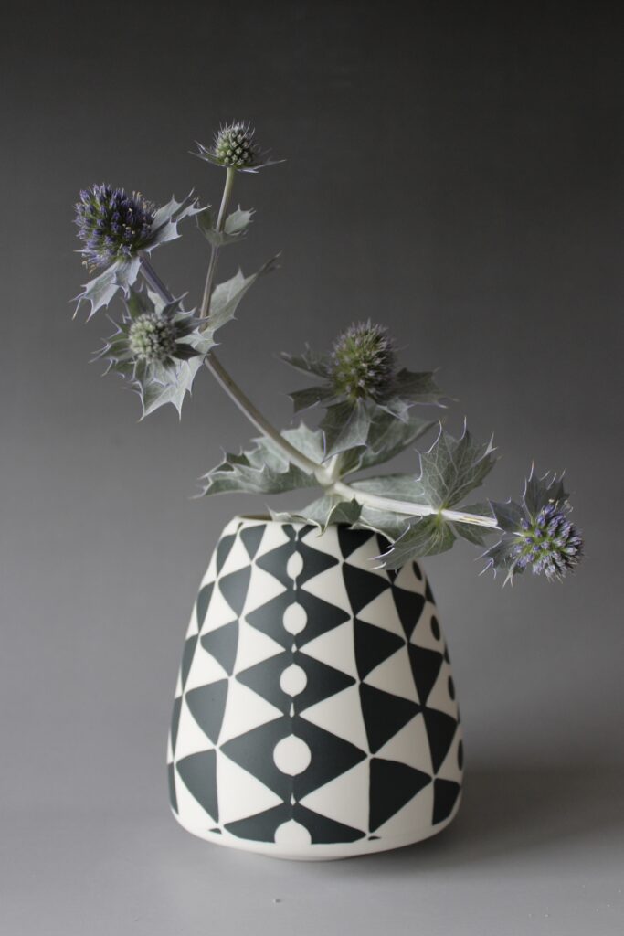 Mijn werk is geschikt voor gebruik maar functionaliteit is ondergeschikt aan artistieke en decoratieve overwegingen. Ik wil niet dat mijn decoraties onder een glad laagje glanzend glas zitten. Daarom gebruik ik liever mat glazuur of laat ik glazuur zelfs helemaal achterwege, zeker aan buitenkanten. Ik vind dat er zo aan het werk meer te beleven is. Ongeglazuurd porselein is van nature zijdemat en voelt fluwelig. Mijn porseleinslib-decoraties voelen door een dun laagje mat glazuur eerder ruw en stekelig. Dat soort tactiele aspecten beschouw ik als toegevoegde waarde voor mijn werk.